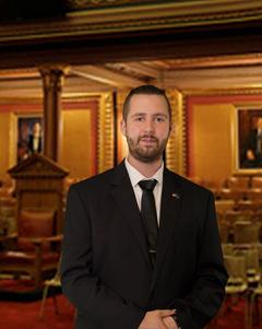 The Senior Deacon sits to the right of the Worshipful Master. He is the Master's messenger and does lots of walking. He welcomes and escorts both visitors and new candidates into the lodge and usually introduces distinguished visitors. During degree rituals, he is the guide for the new candidate, conducting him around the lodge room. In the opening and closing ceremonies of the lodge, the Senior Deacon opens and closes the Bible, and lights or extinguishes the candles at the altar.
