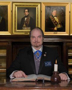 His Jewel of office is an opened book, symbolizing the Volume of Sacred Law.